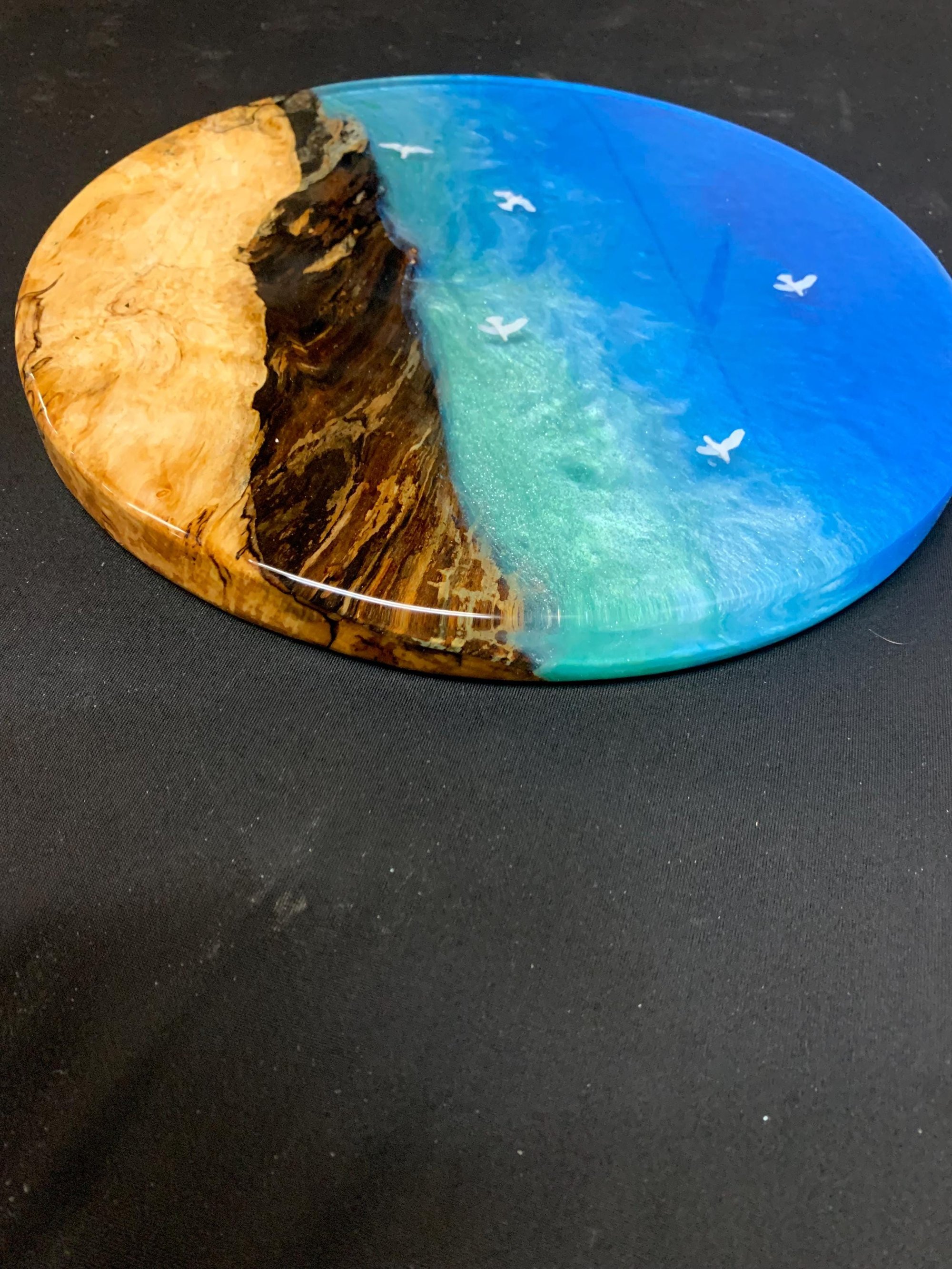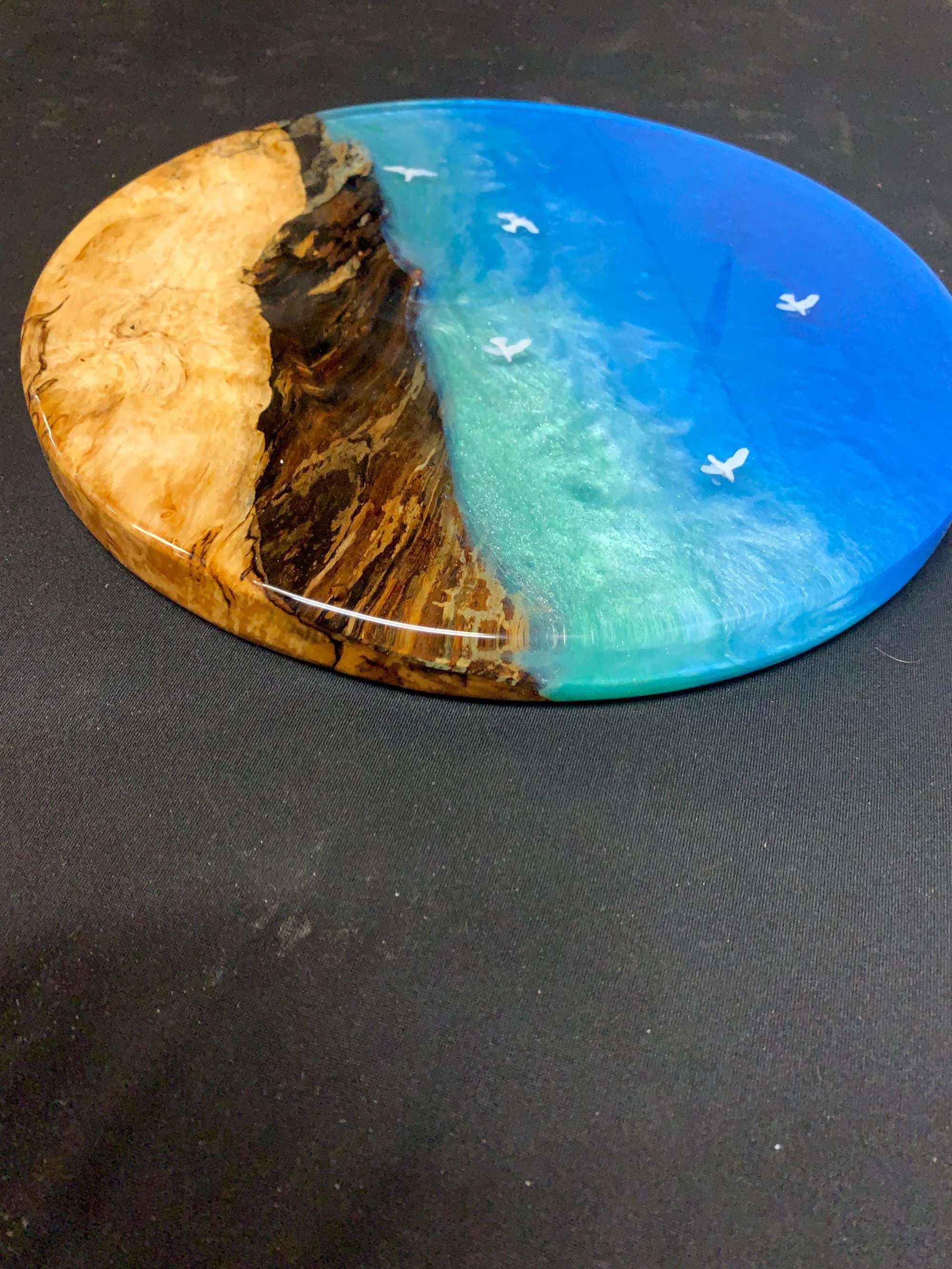 Live Edge Ambrosia Maple Serving Platter: Coastal Resin Ocean Scene