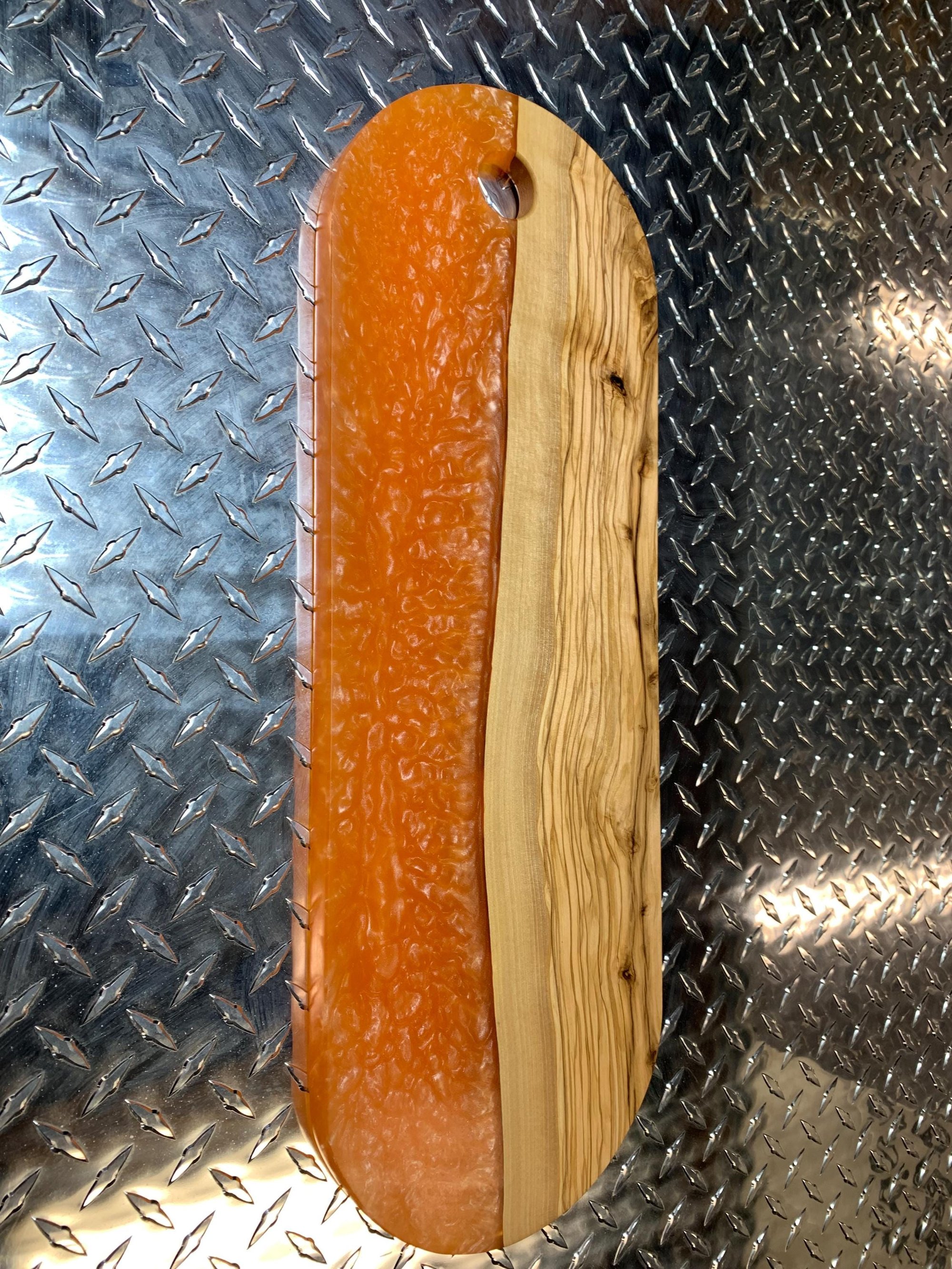 Olive wood live edge bords with a colored epoxy side serving board. the board you receive might have slight variation from the picture but was made at that same time with the same raw materials. variation will be from the natural wood grain itself.
