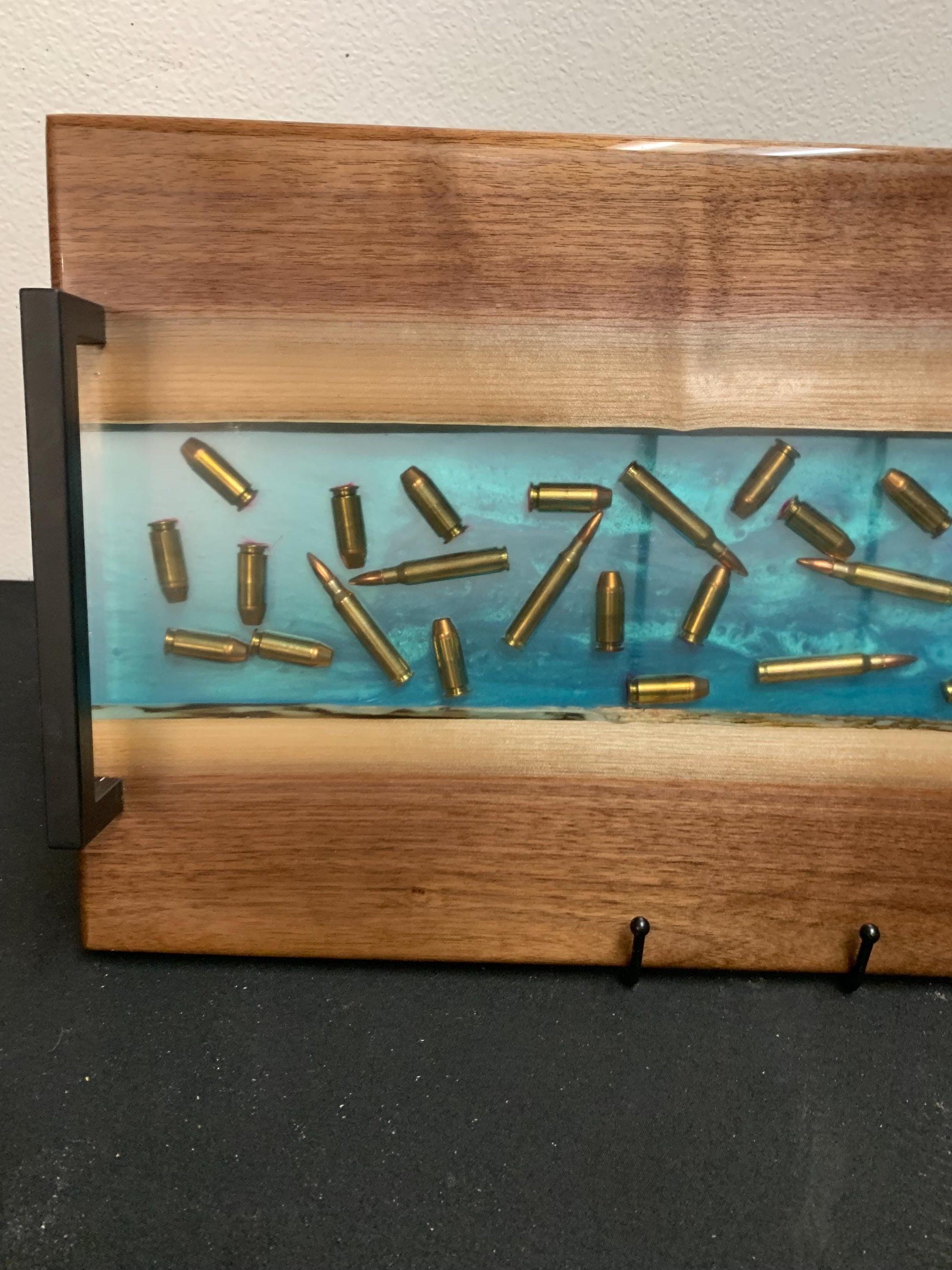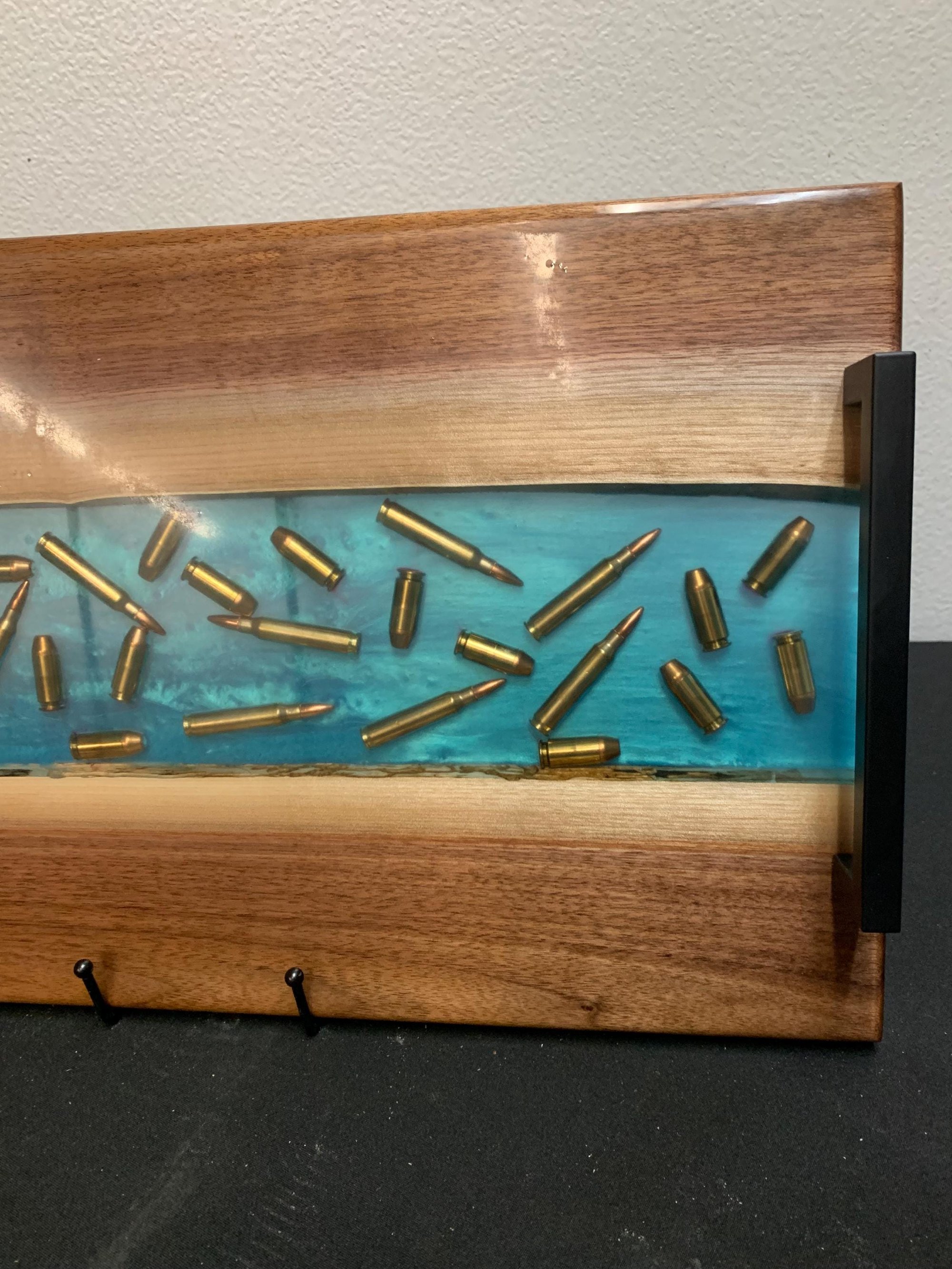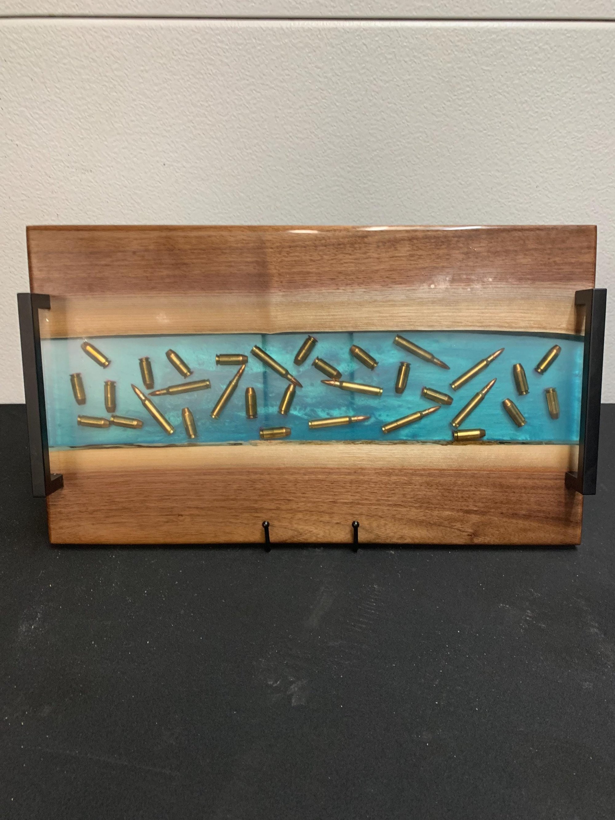 Material: Solid walnut, turquoise epoxy, clear resin, embedded bullets