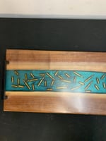 This handcrafted charcuterie board features the rich, dark tones of walnut paired with a bold turquoise epoxy river. Embedded bullets set in crystal-clear resin add a rugged, masculine edge that contrasts beautifully with the vibrant turquoise color. The result is a striking, one-of-a-kind piece of functional art.