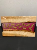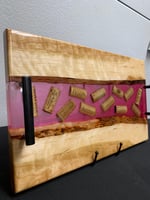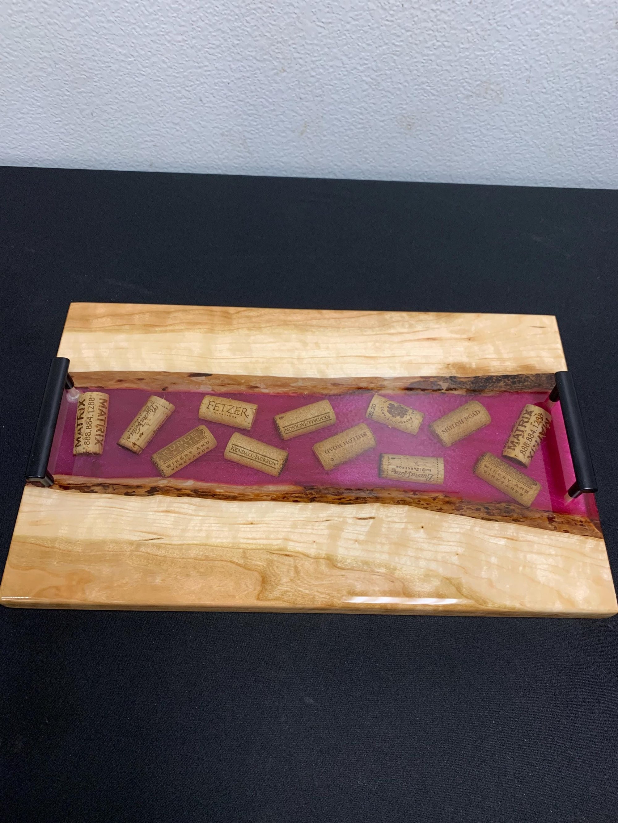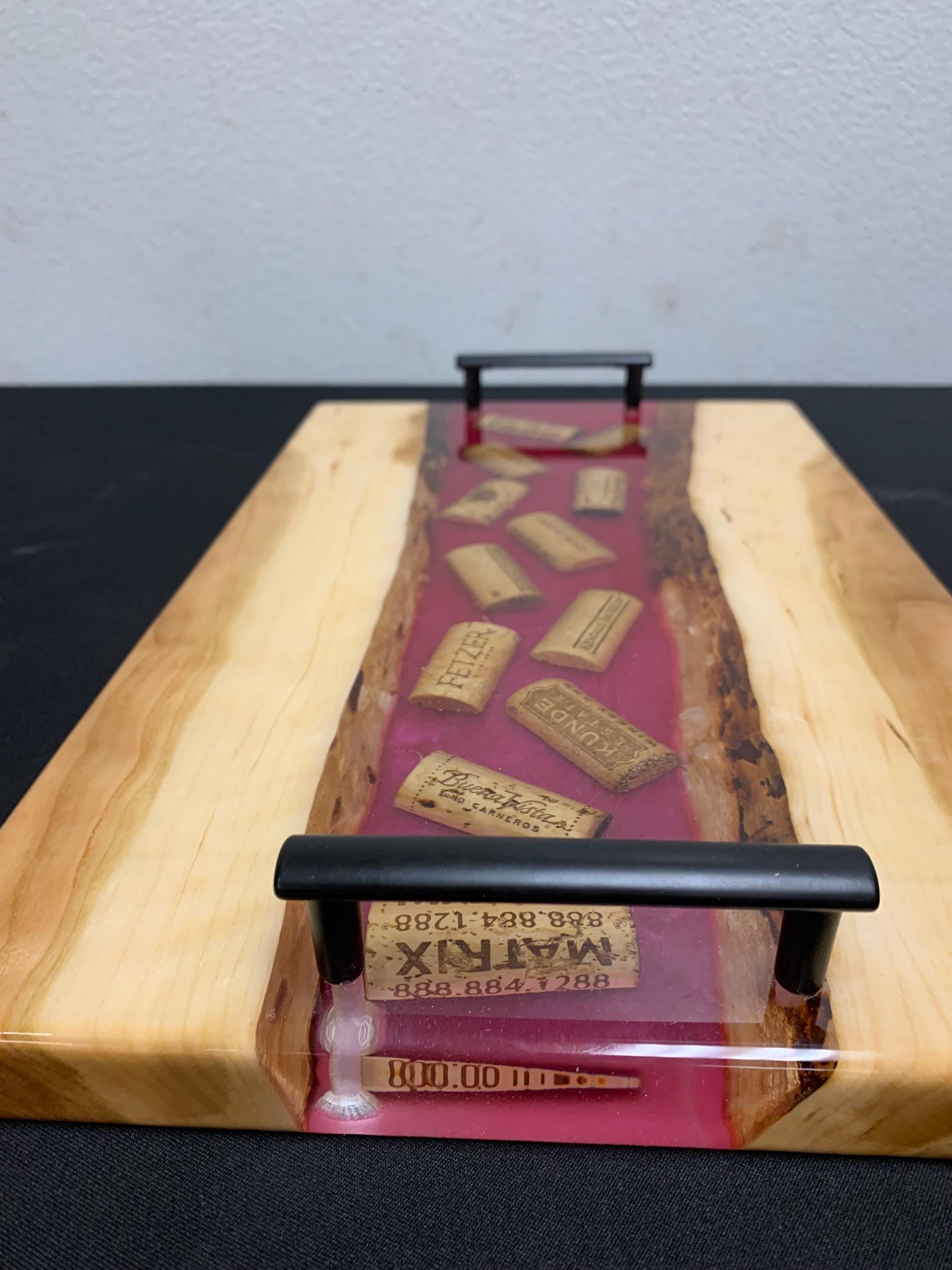 This handcrafted serving tray combines the warmth of rich cherry wood with the character of reclaimed wine corks, set in a crystal-clear epoxy river pour. The natural grain of the cherry wood contrasts beautifully with the textured corks, creating a one-of-a-kind piece that’s both functional and decorative.